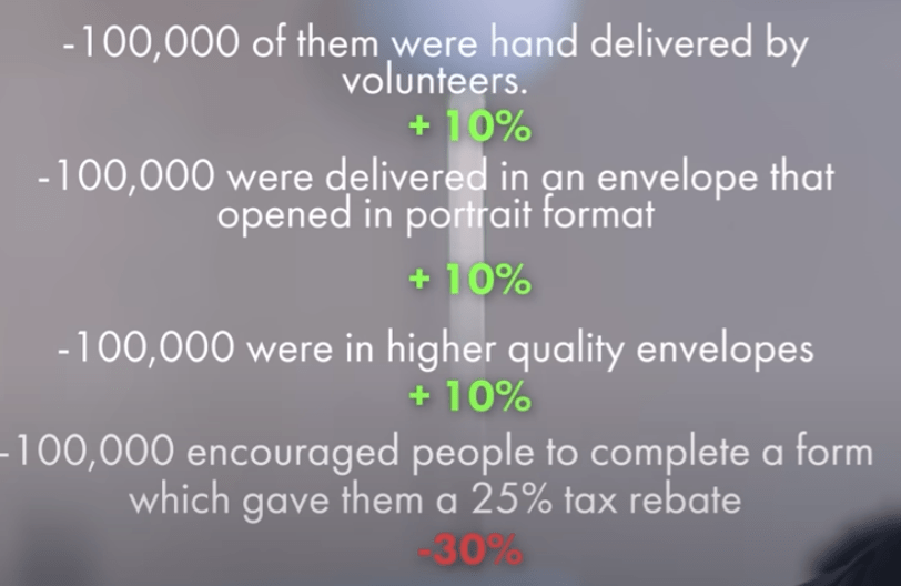 One would think that giving tax rebate to the donors would most likely lead to the most conversions. But that was not the case. A simple act of delivering in high quality of envelope or opening it in portrait format increased conversions by 10%. When volunteers were made to hand deliver them, conversions were more than 10%. All samples inside were same.