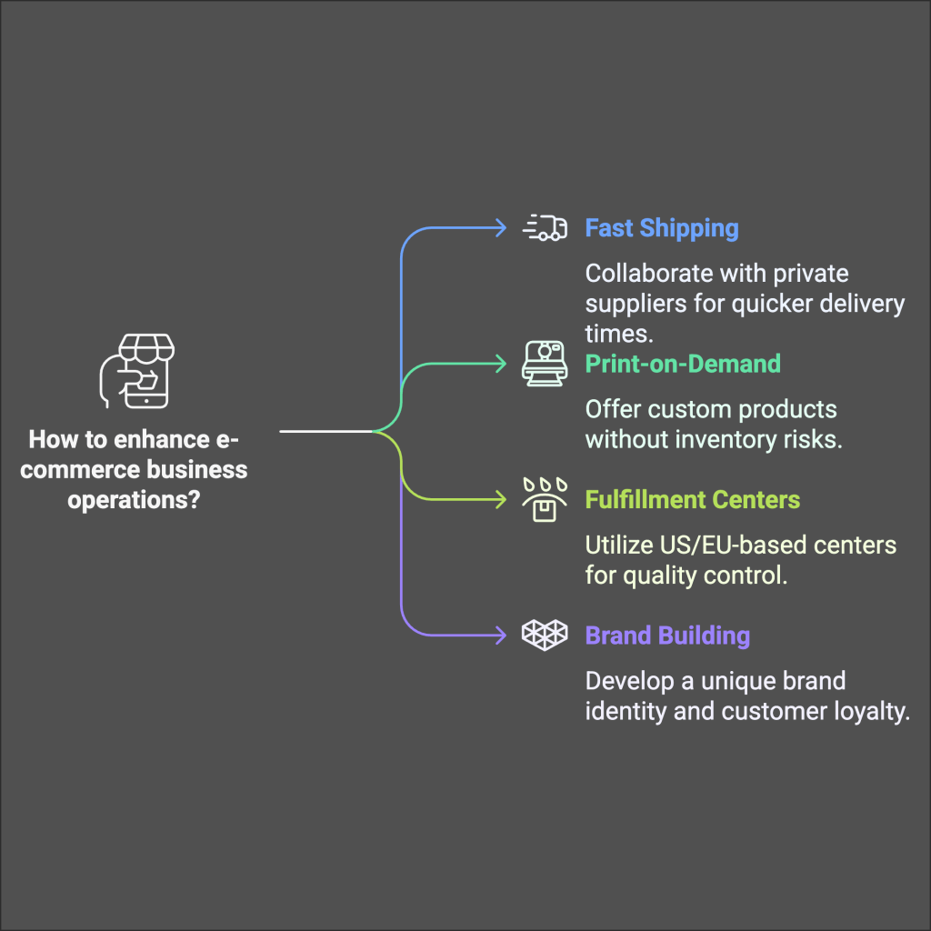 💡 How to Adapt: Start with dropshipping, but plan for a transition to branded fulfillment through services like ShipBob, Printful, or local warehouses.